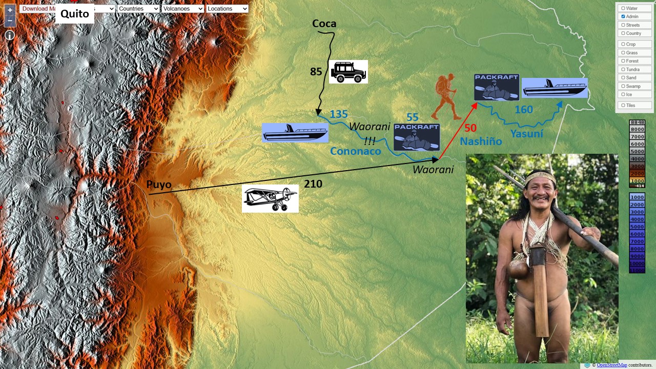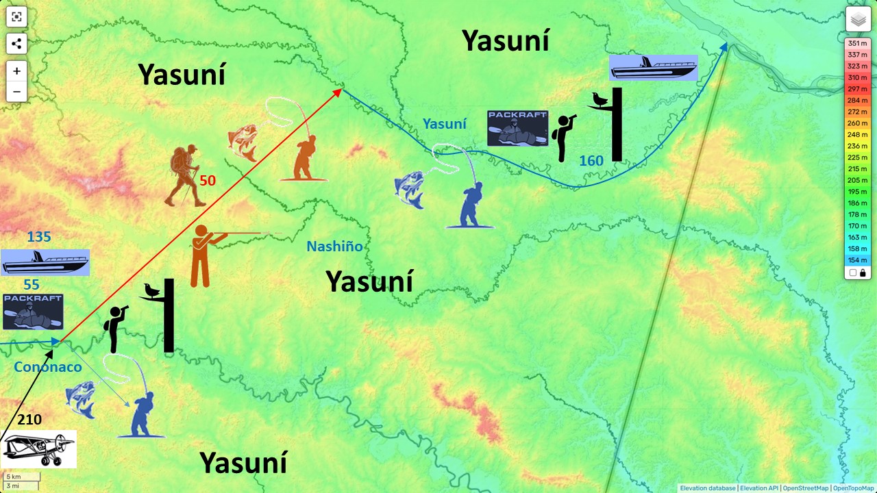 Z naszej bazy wypadowej w wiosce Cononaco, po odpoczynku i aklimatyzacji, rozpoczniemy ponad 50-kilometrową pieszą przeprawę lądową, przez całkowicie niezbadany odcinek Nashiño doliny Yasuní, aż do rzeki Yasuní. Tylko Waorani mają dostęp do serca tego obszaru Yasuní, a my będziemy pierwszymi obcymi, którzy go przemierzą. Spędzimy tam około tygodnia, wędrując ścieżkami znanymi tylko dla Waorani, polując, łowiąc ryby i ciesząc się najdzikszym i najbogatszym lasem deszczowym w Ekwadorze. Drugi tydzień spędzimy na spływie packraftowym rzeką Yasuní do jej ujścia do Napo. Część dolnego odcinka będziemy eksplorować z pomocą motorówki pewnego znajomego z rzeki Napo, który ostatecznie dowiezie nas do punktu końcowego na rzece Napo, w górę rzeki od ujścia Yasuní w Nuevo Rocafuerte. Stamtąd wrócimy do cywilizacji (do Coca) publiczną łodzią motorową.